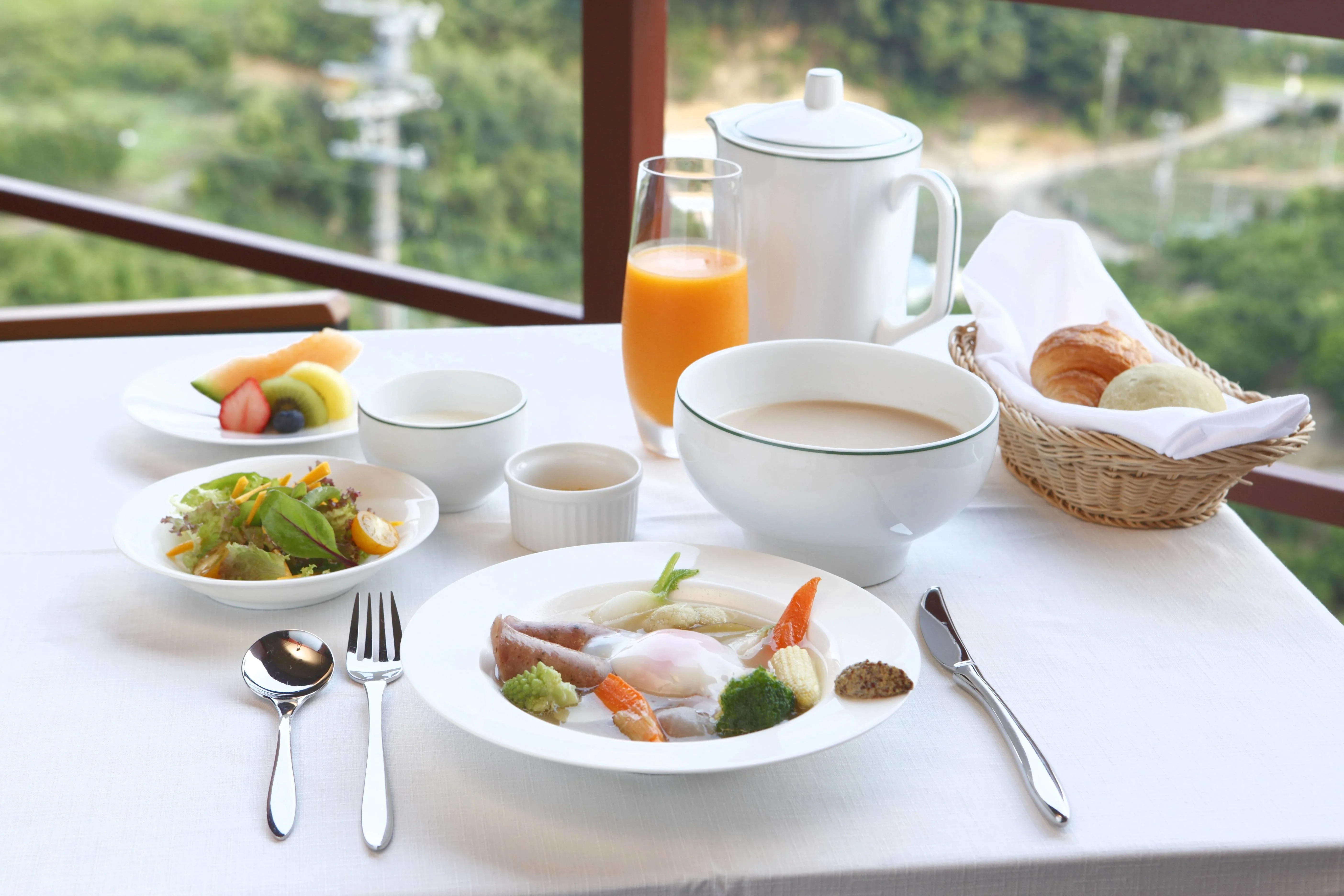 翌朝のテラスでの朝食は、オーベルジュの特権。浜名湖を一望しながら、まるで映画の世界のような朝を迎えられます。